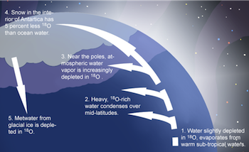 Let's get into the nitty-gritty of it to see how this really works. O-18 is obviously heavier than O-16. This means that O-18, or heavy oxygen, will fall with the rain first. As the rain moves toward higher latitudes, however, there is less and less heavy oxygen and more light oxygen. The general pattern is that as you move from the equator to the poles, the rain has smaller and smaller O-18 to O-16 ratios, with the mid-latitudes enjoying O-18 rich precipitation.