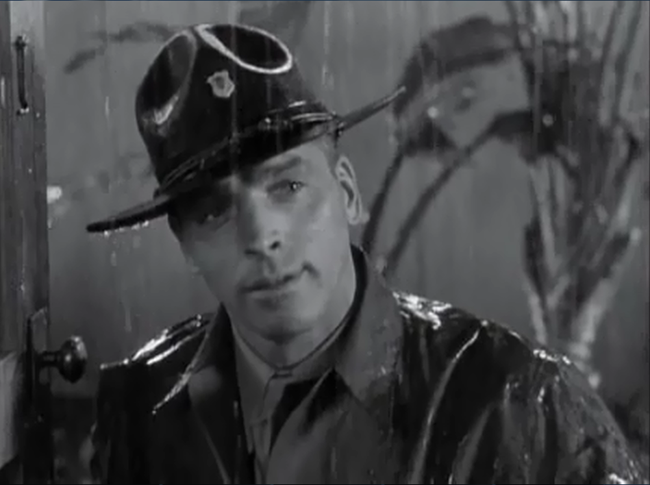 Here's Lancaster standing in the rain, ready to hit on Karen Holmes.