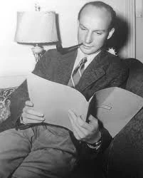 The Director, Robert Stevenson, (not to be confused with the dude who wrote Treasure Island) studies a script with a long pipe in his mouth.