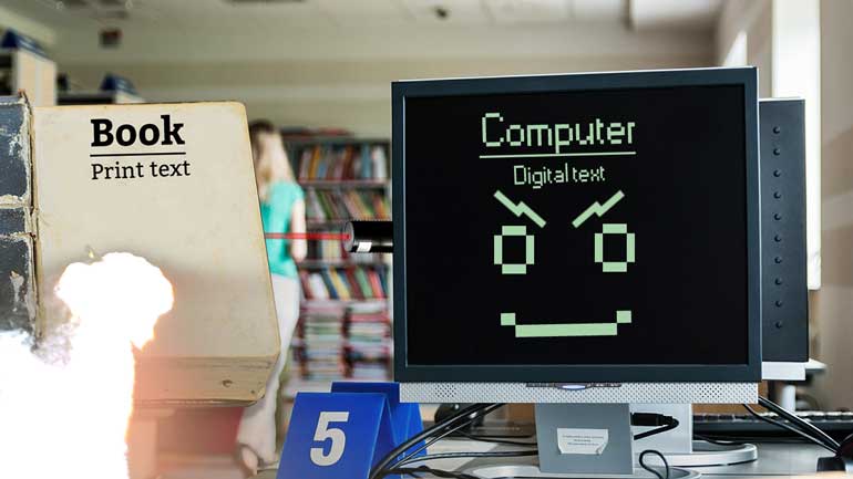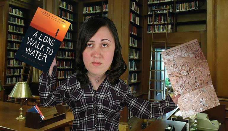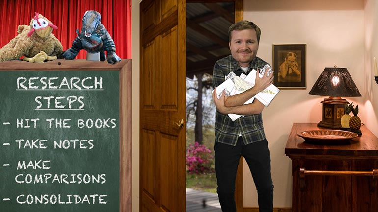 And where might one find a primary source? The library’s not a bad place to start. [Man walks inside a library]
