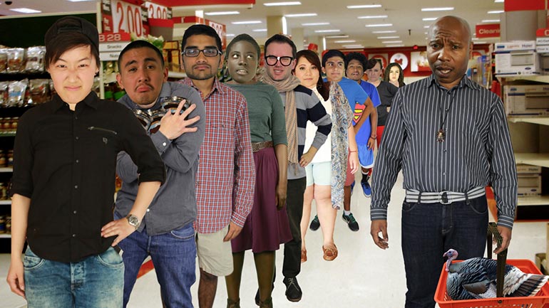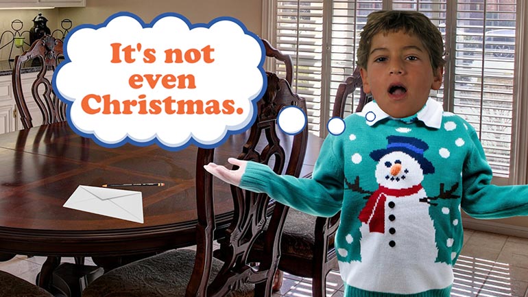 …but…what’s up with it? Why not a blue sombrero? Pink scarf? Yellow fanny pack? [Little Red Riding Hood wearing a blue sombrero, a pink scarf and a yellow fanny pack]