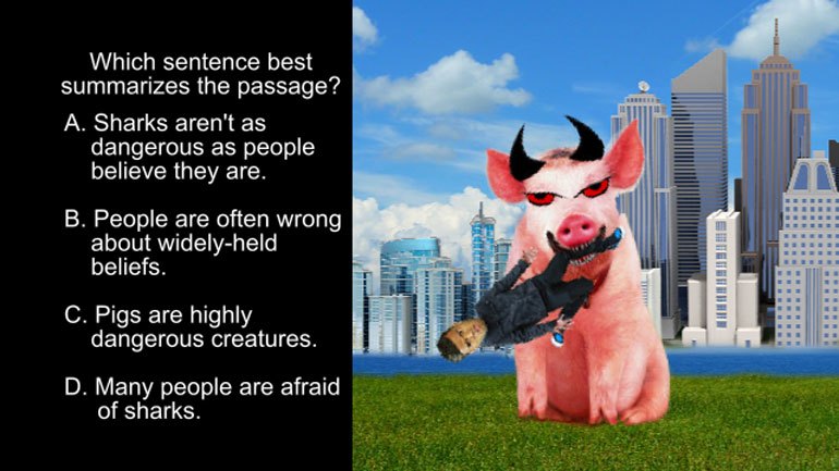Pop quiz - what animal is more dangerous, the pig or the shark? Guess it depends on which one of them is wielding the machete, eh?