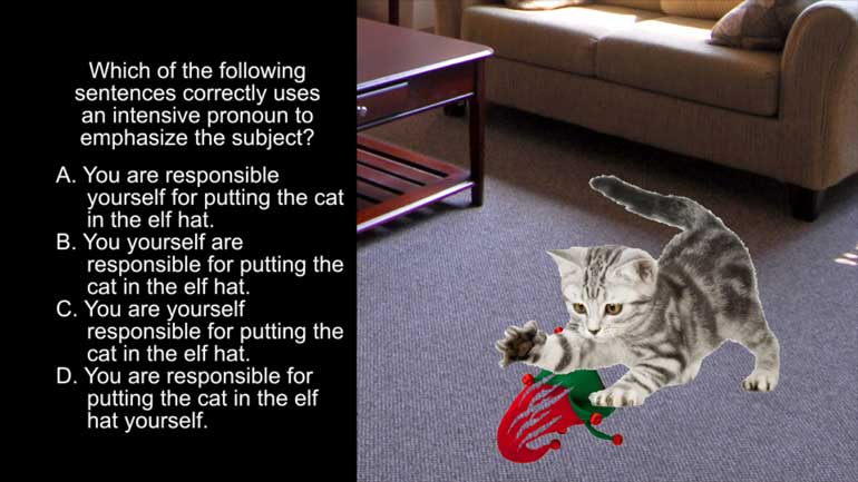 ELA Drills, Intermediate: Parts of Speech 3. Which of the following sentences correctly uses an intensive pronoun to emphasize the subject?
