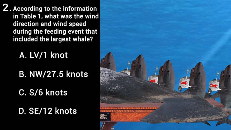 According to the information in Table 1, what was the wind direction and wind speed during the feeding event that included the largest whale?