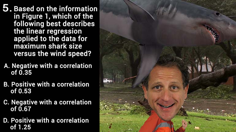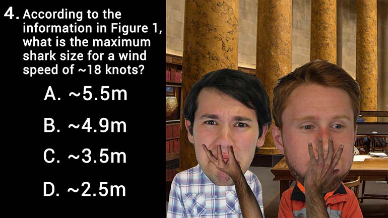 According to the information in Figure 1, what is the maximum shark size for a wind speed of ~18 knots?